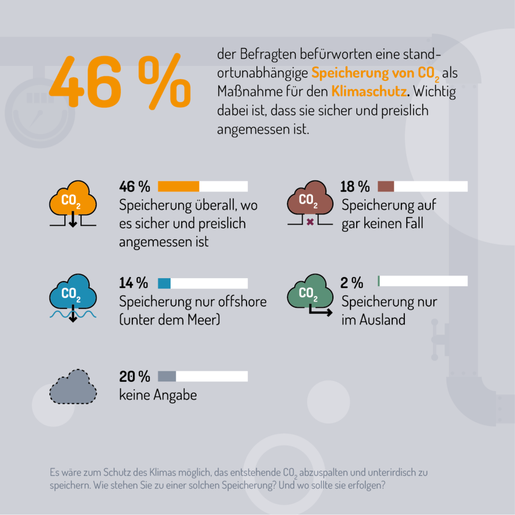 Wie gehen wir mit dem klimaschädlichen CO₂ um, das in Deutschland entsteht? 56 % der Befragten sprechen sich dafür aus, nach dem Verursacherprinzip vorzugehen, also das CO₂ dort zu entsorgen, wo es entstanden ist. Insgesamt stehen die Befragten der CO₂-Speicherung offen gegenüber. 46 % sprechen sich für eine standortunabhängige CO₂-Speicherung als Klimaschutzmaßnahme aus. Wichtig ist, dass sie sicher und bezahlbar ist.